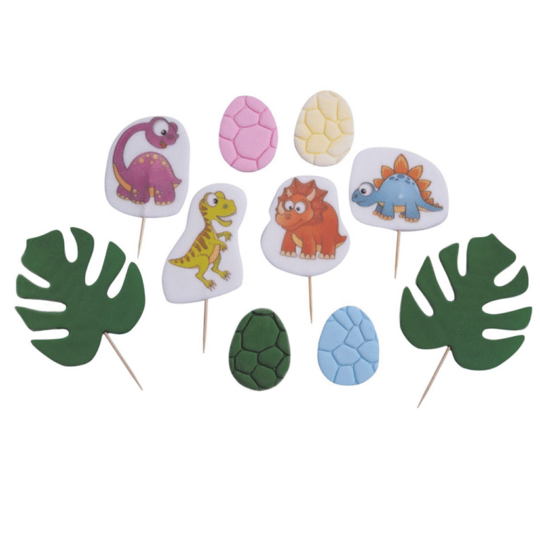 Składa się na niego 10 słodkich elementów przedstawiających dinozaury, jajka i liście. Figurki cukrowe mają różny kształt, kolorystykę i wymiarach.