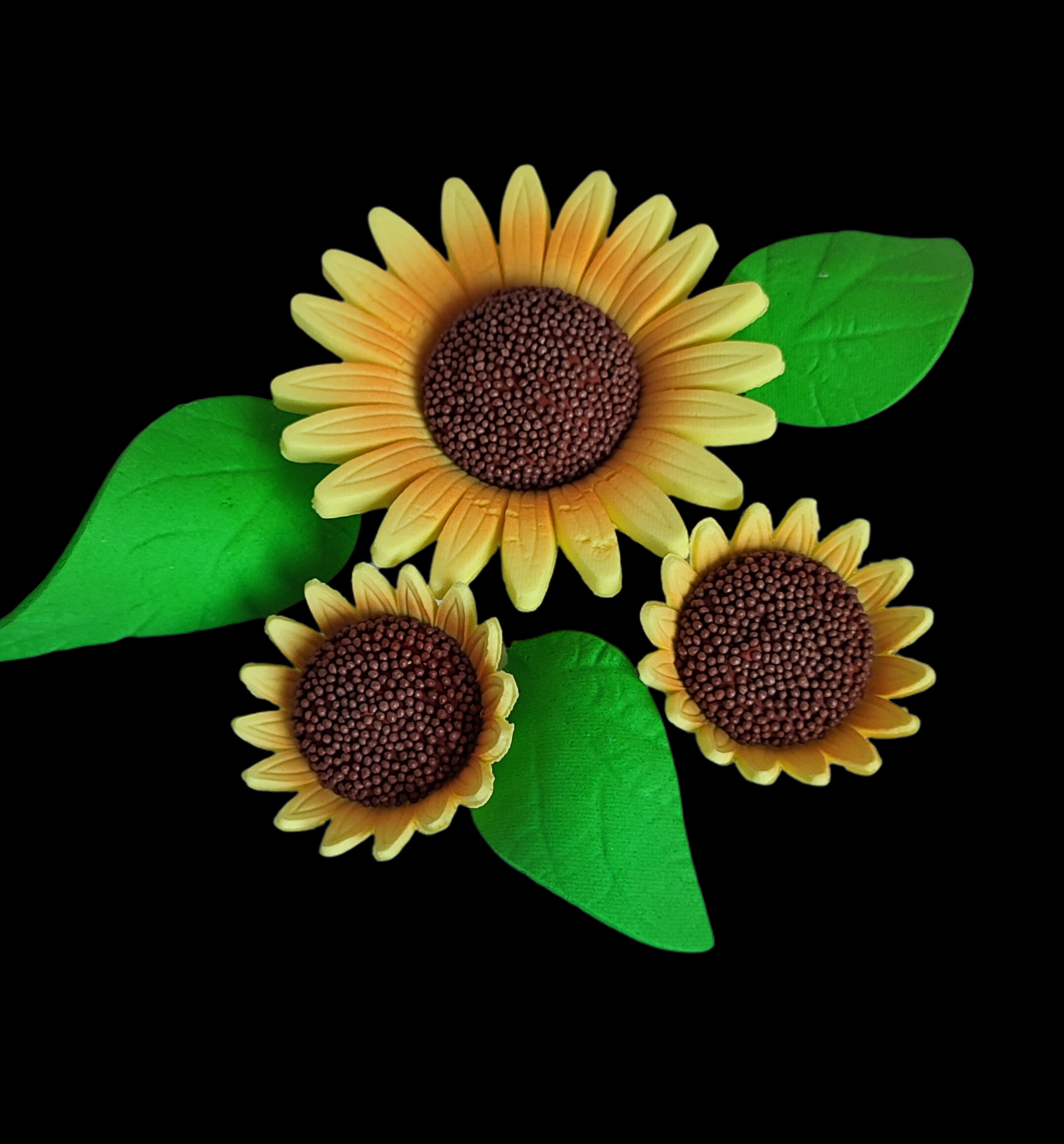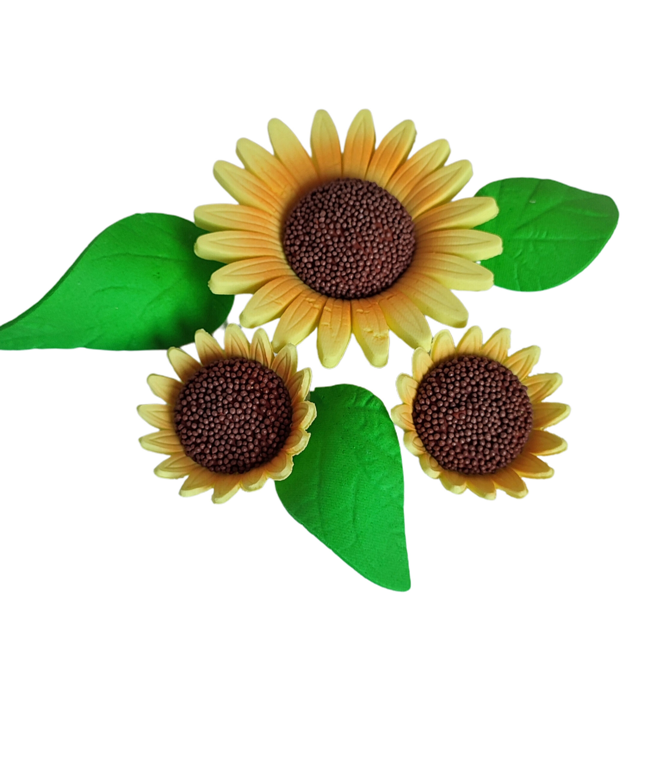 W zestawie 3 kwiaty słonecznika w różnych rozmiarach oraz 3 duże liście.