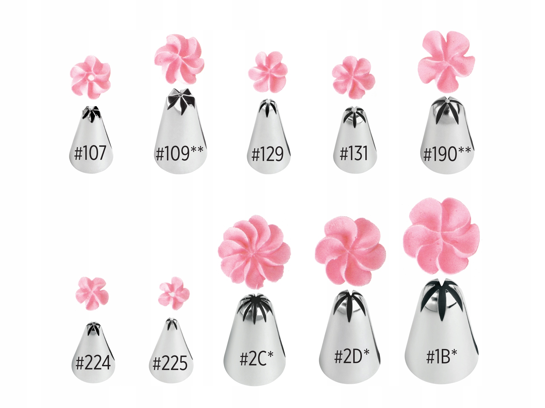 Zestaw Tylek WILTON #109, #129, #190, #225 to zestaw 4 końcówek cukierniczych zaprojektowanych do tworzenia kwiatków na wypiekach, takich jak torty, ciasta czy babeczki. Tylki #109 i #129 służą do robienia kwiatków sześciopłatkowych, natomiast #190 i #225 do kwiatków z pięcioma płatkami. Końcówki wykonane są z wysokiej jakości stali nierdzewnej, co zapewnia trwałość i łatwość czyszczenia, także w zmywarce. Można nimi dekorować za pomocą kremu maślanego, bitej śmietany lub lukru. Każda tylka ma odpowiednią średnicę podstawy i rozmiar otworu dostosowany do różnorodnych efektów dekoracyjnych (np. #225 ma otwór 5 mm, #129 – 7 mm). Dzięki temu zestawowi można wykonać szybko efektowne i estetyczne dekoracje kwiatowe na wyrobach cukierniczych