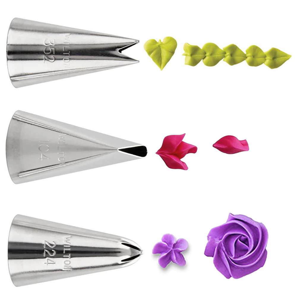 Zestaw tylek WILTON #352, #104, #224 to profesjonalny zestaw metalowych końcówek cukierniczych do dekoracji kremem, lukrem, śmietaną czy czekoladą.