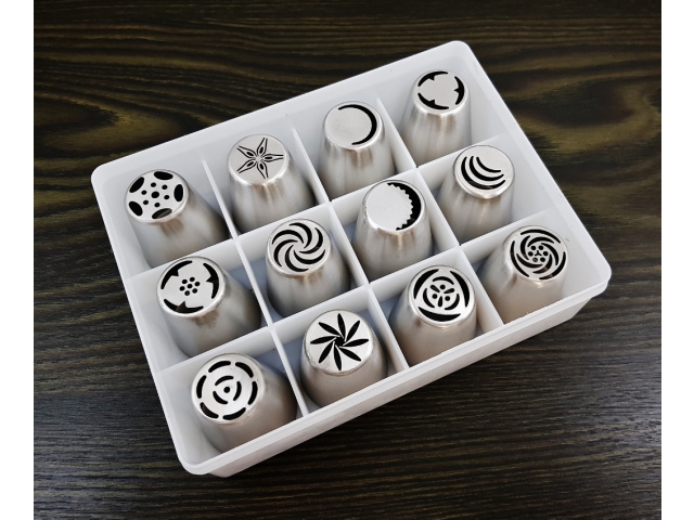 Zestaw Tylki rosyjskie duże 12szt w pudełku to profesjonalny komplet 12 metalowych tylek cukierniczych, każda o innym kształcie, przeznaczony do dekoracji wypieków, zwłaszcza dużych i efektownych kwiatów z kremu. Tylki wykonane są ze stali nierdzewnej, co zapewnia ich trwałość i odporność na uszkodzenia. W zestawie nie ma rękawa, a tylki mają wymiary około 4 cm wysokości, 3,5 cm średnicy podstawy i średnica otworu roboczego wynosi około 2,3-2,5 cm. Całość zapakowana jest w praktyczne pudełko ułatwiające przechowywanie i organizację narzędzi.